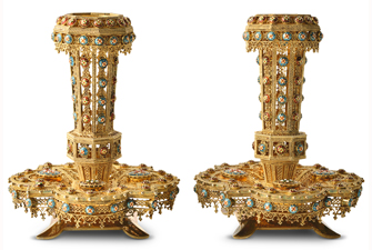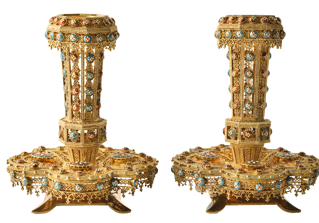 Fornet’s workshop (v.1870-1897), Candlesticks, enamel-gold-cut glass-vermeil, h. 12,5 x diam. 9,8 cm.