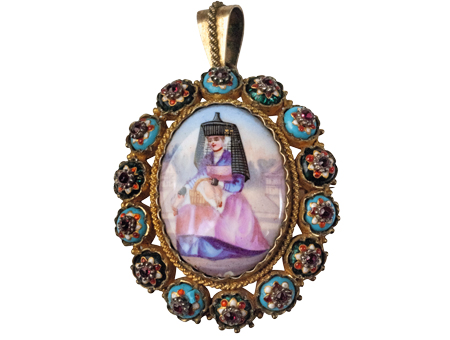 The affordability of enamels put them within the reach of comfortably-off farming families. They were a good substitute for precious stones, and were bought in the form of jewellery or decorative objects. These items were given as special gifts, which were used to mark religious and civic rites of passage, and seem closely linked to their establishment and preservation. A cross pendant would be given at a child’s first communion, a suitor would present his beloved with a necklace en esclavage, mothers and daughters passed on their jewellery from one generation to the next. Enamels were often worn on these occasions. The image of the lady farmer in her Bressan enamels which appears on post cards and on tourist souvenirs may lead to believe that this was a frequent sight. We must bear in mind that the purpose of this image is more to express local culture than to accurately represent local practices.