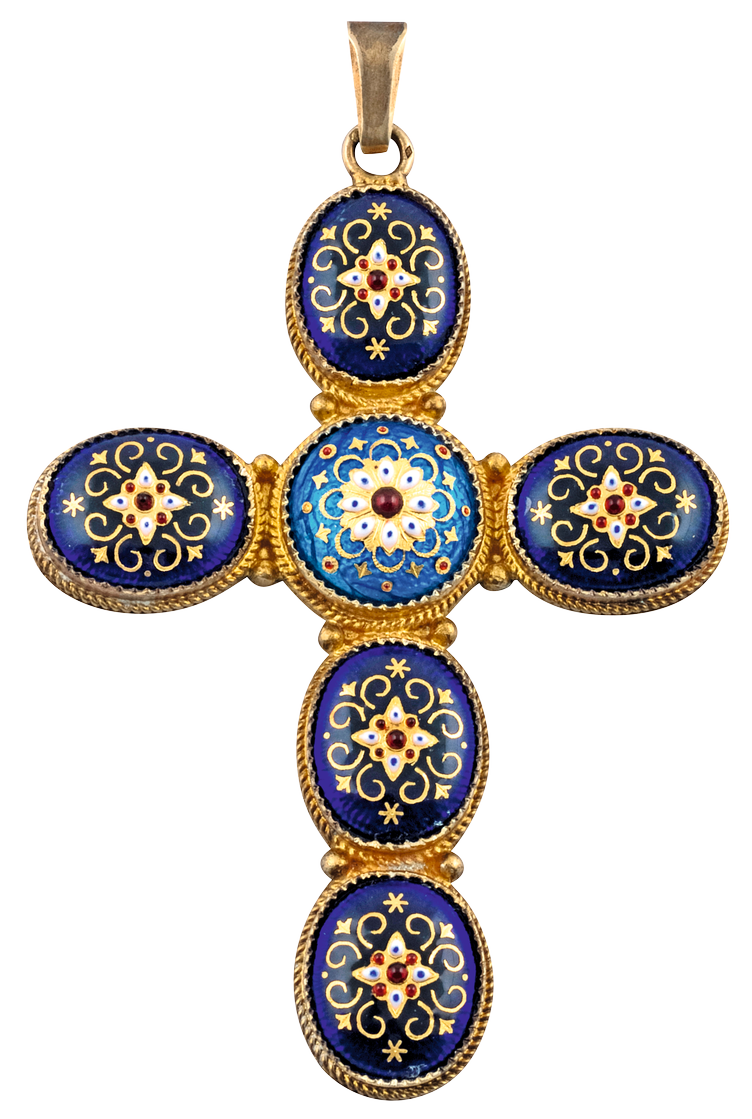Merle’s workshop (1992-1996), Cross pendant, enamel-gold-cut glass-silver, h. 10,6 x l. 6,8 x ép. 1,1 cm.