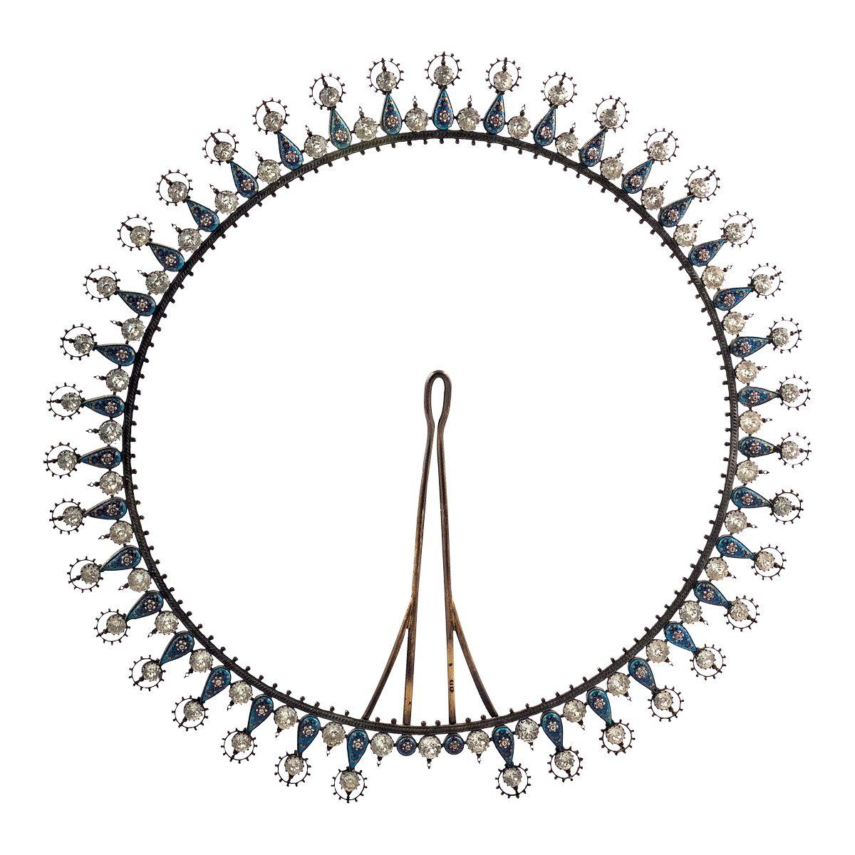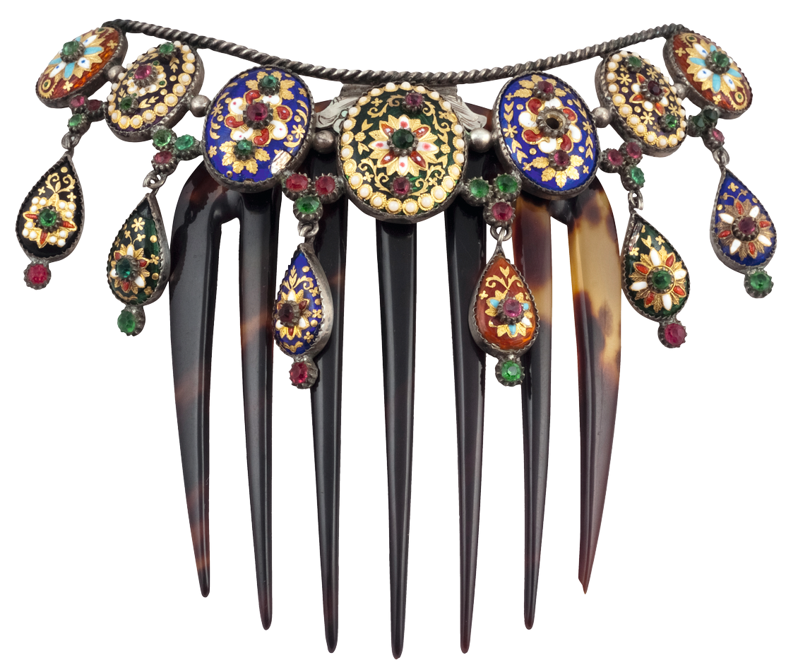 Unknown, Hair comb, enamel-gold-cut glass-silver-plastic, h. 9,7 x l. 10,5 x ép. 3,5 cm. This hair comb was perhaps worn by Russian ballerina Anna Pavlova.
