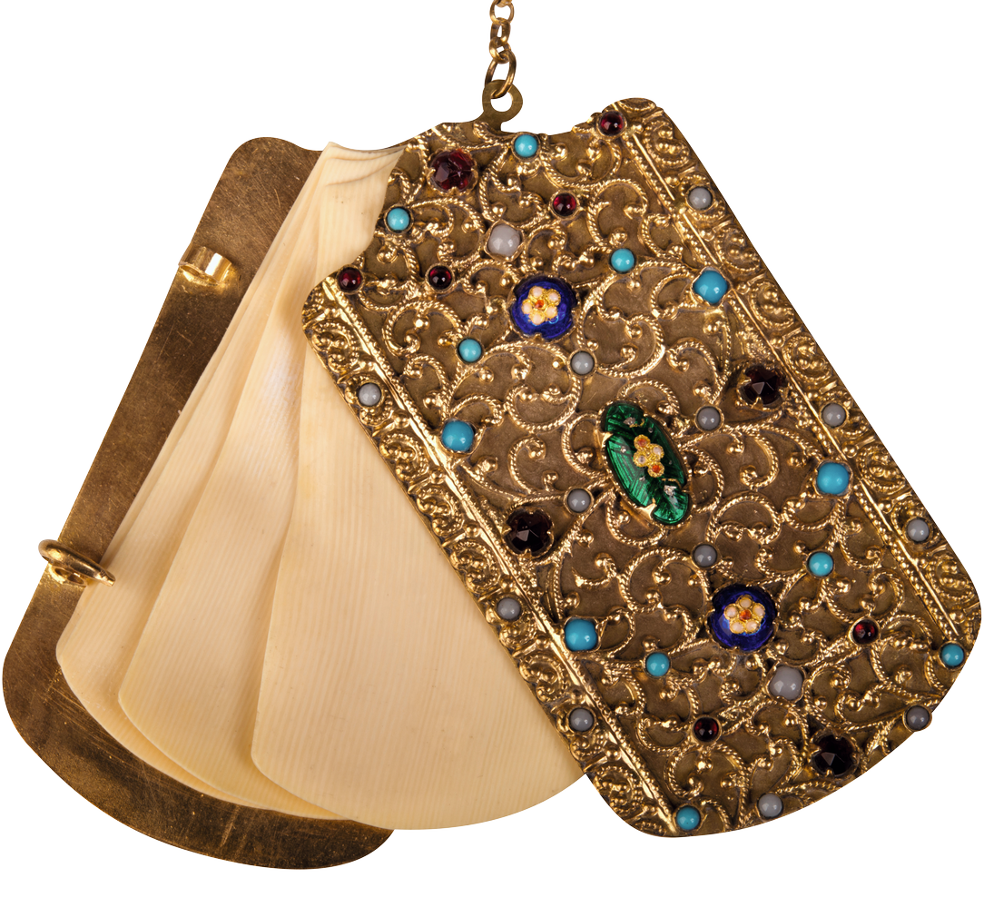 Unknown, Dance card, enamel-gold-cut glass-vermeil, L. 7,5 x l. 4 cm. Dance cards were used during dances of the 19th century where the guests had to respect the name of their partners decided in advance and noted on it.