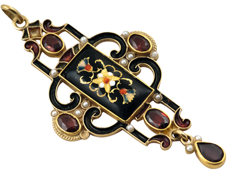 Papi Percossi (Rome, since 1968), Debost’s workshop (v.1922-1992), Pendant, Enamel-gold-cut glass-mother of pearl-garnet, h. 6,4 x l. 3,2 x ép. 0,6 cm.