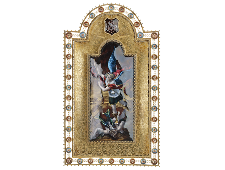 Fornet’s workshop (v.1870-1897), Saint Michael slaying the dragon, enamel-gold-cut glass-vermeil, h. 34,5 x l. 21 x ép. 4,4 cm.