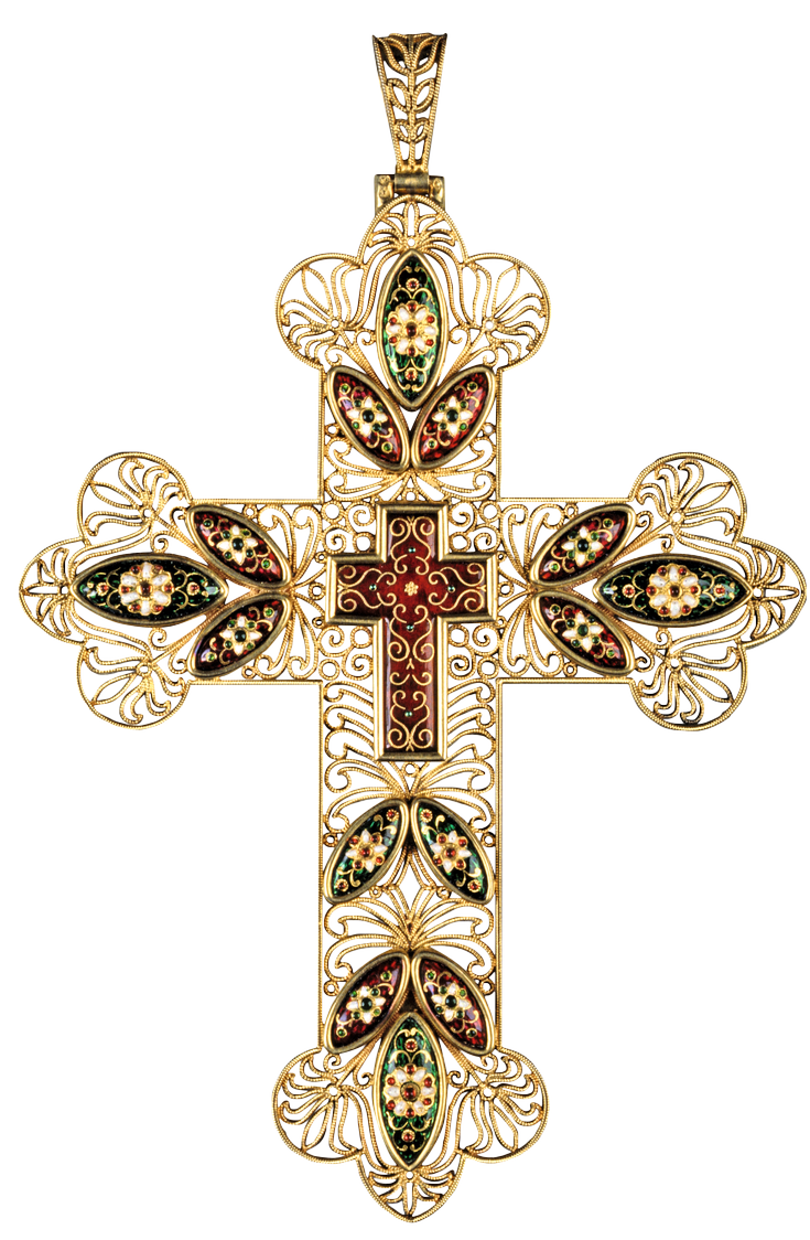 This was the case of Amédée Fornet. He used Bressan enamels and made the golden filigree to decorate the crowns of the Black Madonna and the Infant Jesus worshipped at Notre-Dame church of Bourg-en-Bresse, and worked with Lyon goldsmiths such as Armand-Calliat to create the main altar of this co-cathedral. Enamellers from Bourg worked for significant religious sites in Ain. They created pectoral crosses for the bishops of Belley and the priest of Ars, which are, highly unusually, decorated with interlaced filigree with little enamel plaques. They may have used Parisian and Limousin painted enamels to decorate small devotional objects such as holy water fonts and reliquaries.