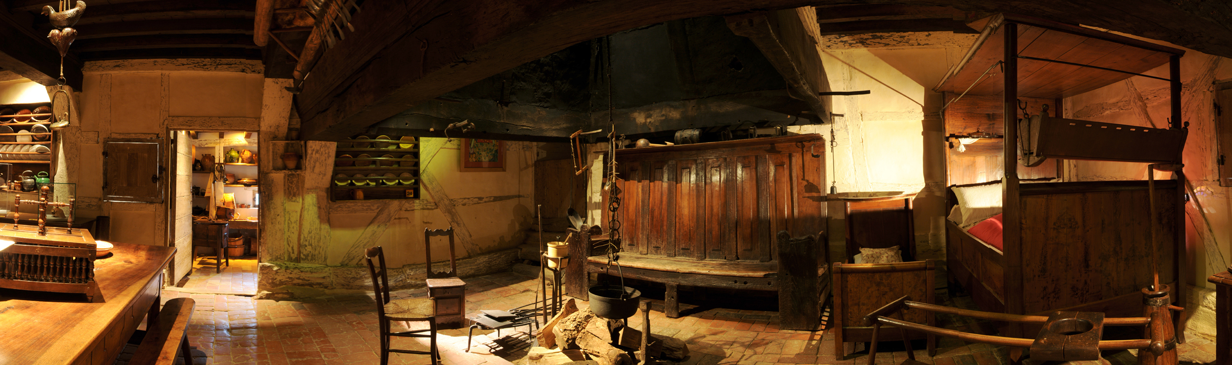 The farm, built between 1603 and the 19th century, is an architectural feat, fortunately saved thanks to its registration as a Historic Monument in 1938. An example of Bressan architecture, this farm of exceptional beauty is made up of five bodies of timbered buildings, with materials such as cob and loam used in their construction, organised around a vast courtyard with the outbuildings and main house. It is characterised by not one but two galleries lining the courtyard, with stylish arcades and the famous and rare "cheminée sarrasine", an unusual form of chimney, a typical Bressan architectural feature. A reconstitution based on an inventory taken after the death of an occupant in 1784 transports the visitor into the interior furnishing of this habitation, relatively common around the time of the French Revolution.