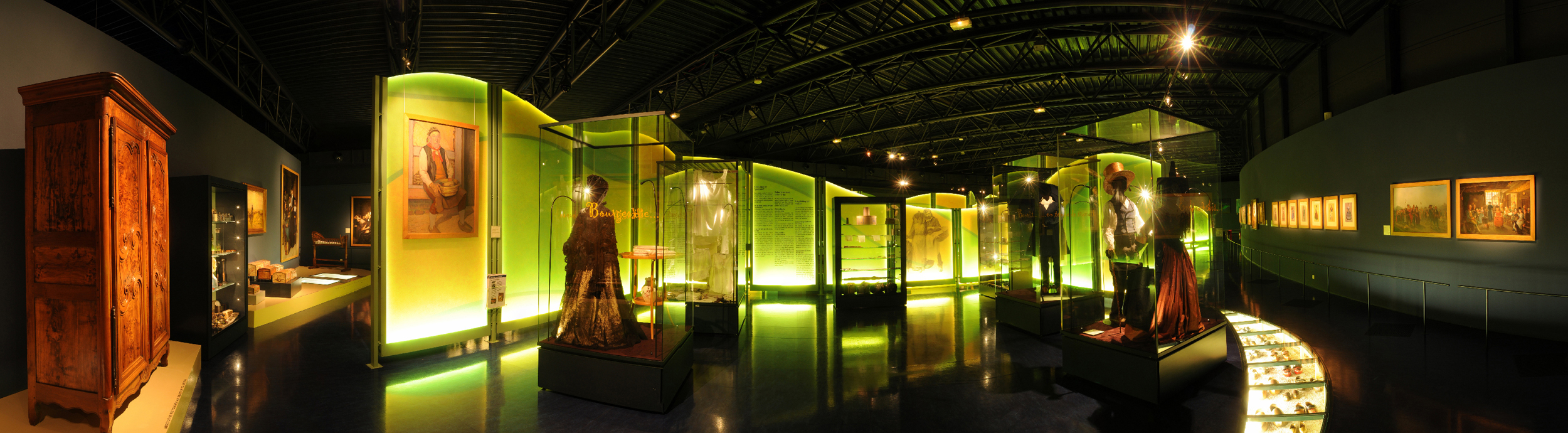 Opened in 2005, the museum, built for purpose, is deliberately anchored in the 21st century thanks to its use of materials, its architectural style and contemporary scenography. Meandering through curved glass panels evoking a wooded countryside, the visitor views collections on two themes: traditional regional costume, presented in all its diversity and closely associated with Bressan enamels; and Bresse's culinary style, of which various aspects are presented: cultivation of quality products and development of agricultural practices, home cooking and preserving, gastronomy and top chefs, manners and table setting.