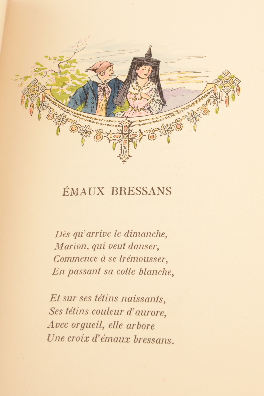 Cette photographie de Jean-Baptiste Tournassoud (Montmerle-sur-Saône, 1865-1951) met en scène une bressane vêtue du costume traditionnel bressan et arborant sur son devanti une broche en émaux bressans. Elle porte également une croix pendentif en émaux bressans. Cette imagerie a conduit à laisser penser que les émaux étaient essentiellement des bijoux et inextricablement associés au costume traditionnel. Or des objets tels que le carnet de bal, les jumelles, les encriers démontrent que les émaux bressans étaient employés pour d’autres usages et adoptés par des catégories sociales aisées et citadines.