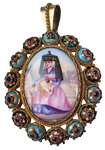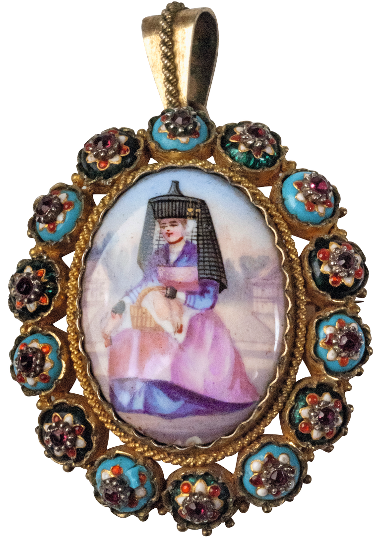Ce pendentif-broche porte à lui seul la caractérisation de la culture bressane telle que les Bressans eux-mêmes pouvaient se la représenter, et au travers de laquelle ils pouvaient se reconnaître et souhaitaient être identifiés au-delà des limites géographiques de la Bresse (de l’Ain). Savoir-faire et imagerie considérés comme signifiants de la Bresse sont étroitement associés. La corde dorée finement travaillée, en plus de révéler la subtilité des coloris de l’émail, associe et assure la transition entre la monture et la plaque peinte. La scène figurée se situe en milieu rural : à l’arrière-plan, deux fermes à pan de bois implantées dans le bocage encadrent une Bressane vêtue du costume régional dont le chapeau à cheminée domine la composition. Sur un linge blanc, dans un panier posé sur les genoux, reposent deux volailles de Bresse mortes, tête en bas. Cette image est ancrée : elle correspond aujourd’hui encore à notre propre représentation de la Bresse, elle est aussi exploitée dans les outils de communication actuels.