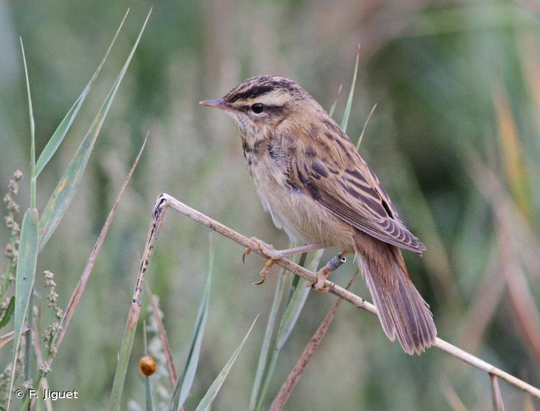 Le Phragmite des joncs (Acrocephalus schoenobaenus) évolue dans un autre milieu, on le retrouve dans les roselières et phragmitaies, et est donc considéré comme un oiseau de zones humides. Avec son sourcil blanc qui permet de le reconnaître, l’adulte chante depuis un perchoir pour intimider les intrus pénétrants dans son territoire.