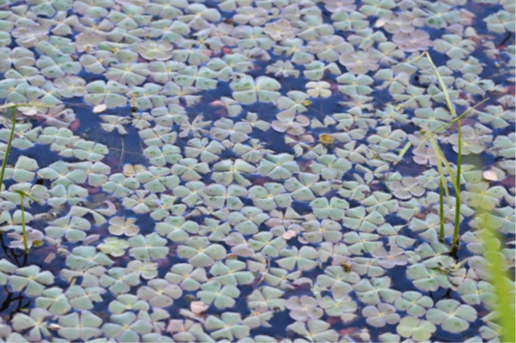 La Marsilée à quatre feuilles est une plante aquatique appréciant les plans d’eau aux berges à pente douce, comme celles de certains étangs en Dombes. De la famille des fougères, elle est tout à fait remarquable, notamment par la forme de ses frondes divisées en quatre lobes, disposés en croix et rappelant celle d’un trèfle à quatre feuilles.