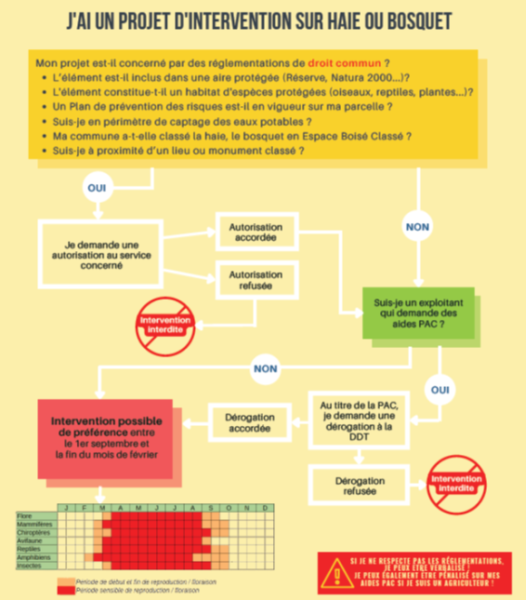 Tout projet d’intervention sur haie ou bosquet (entretien, remplacement, déplacement, destruction) doit se conformer à ces différentes réglementations.